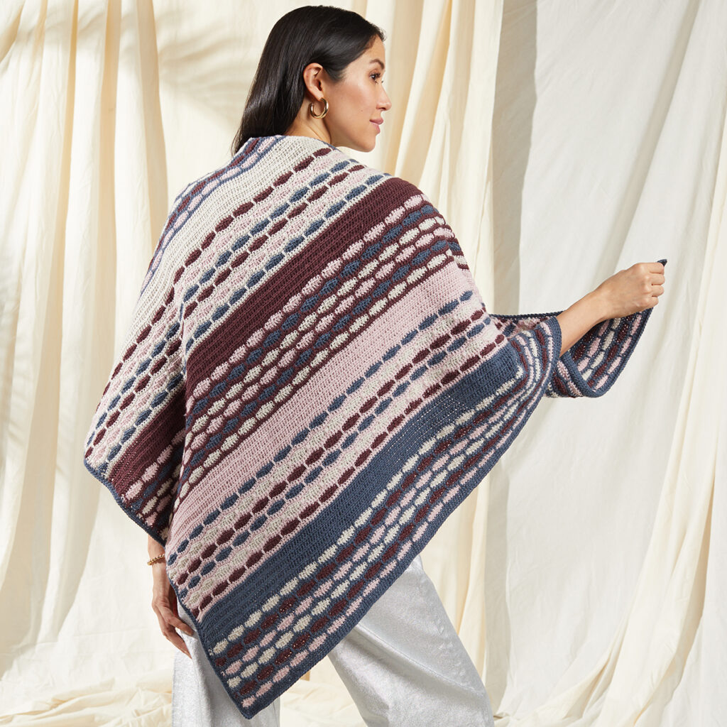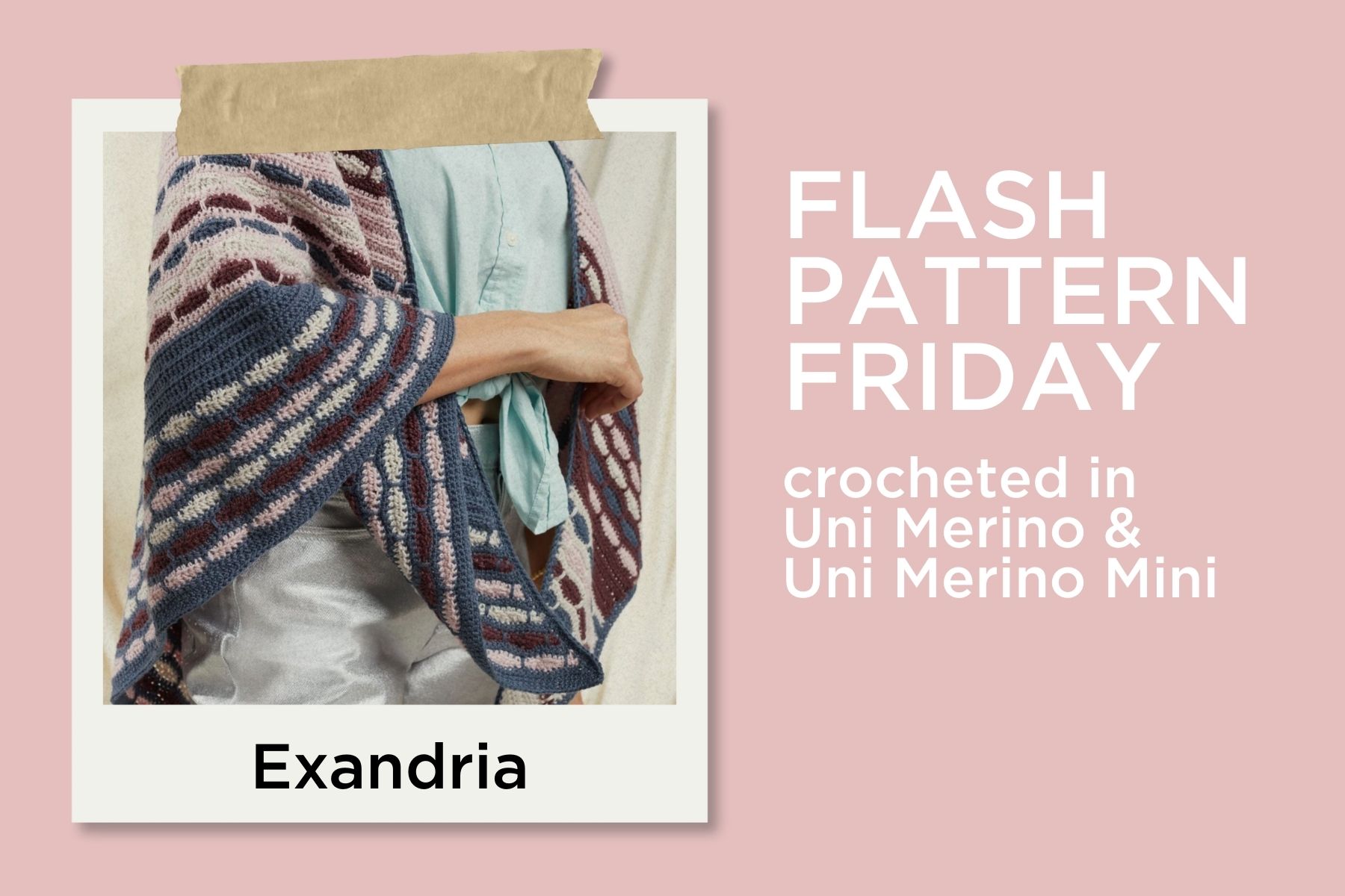 Colorwork tiles sashay across the shawl in a rhythmic quartet of alternating colors, creating a piece as fluid and graceful as a choreographed dance. Perfect for keeping cozy in winter or dressing up in the spring months to come, Exandria is an exquisite transitional accessory, beautifully crocheted in lightweight-yet-warm Uni Merino.