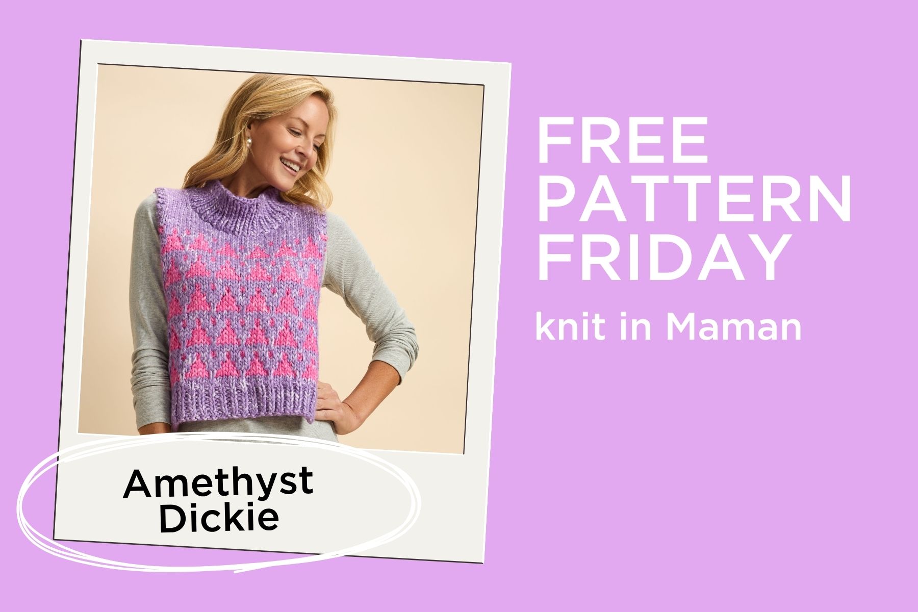 Happy Friday, yarn friends! This week’s free pattern is a party for your needles, bursting with color and whimsy. Introducing the Amethyst Dickie by Patty Olson!