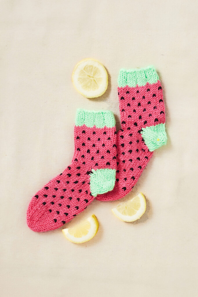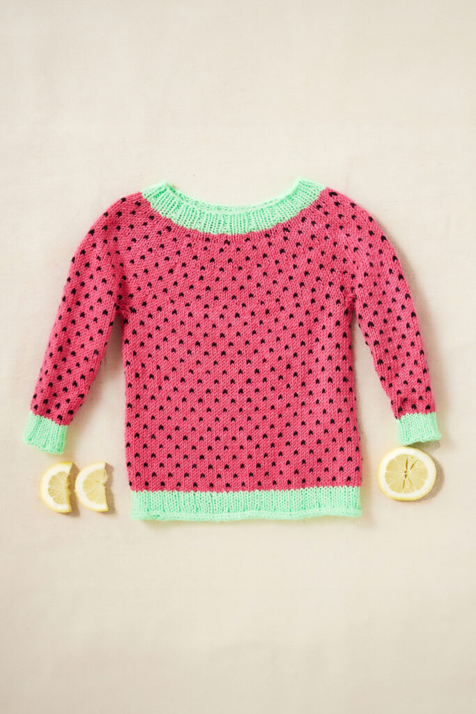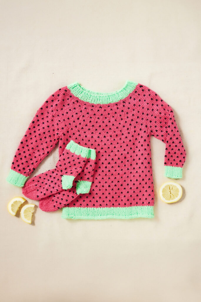 This clever design utilizes colorwork and contrasting trim in three vibrant shades to mimic a ripe, refreshing watermelon – the perfect summer treat! Both beginner-friendly pieces are worked in the round from the top down, and make great intro projects for anyone wanting to dip a toe into stranded knitting.