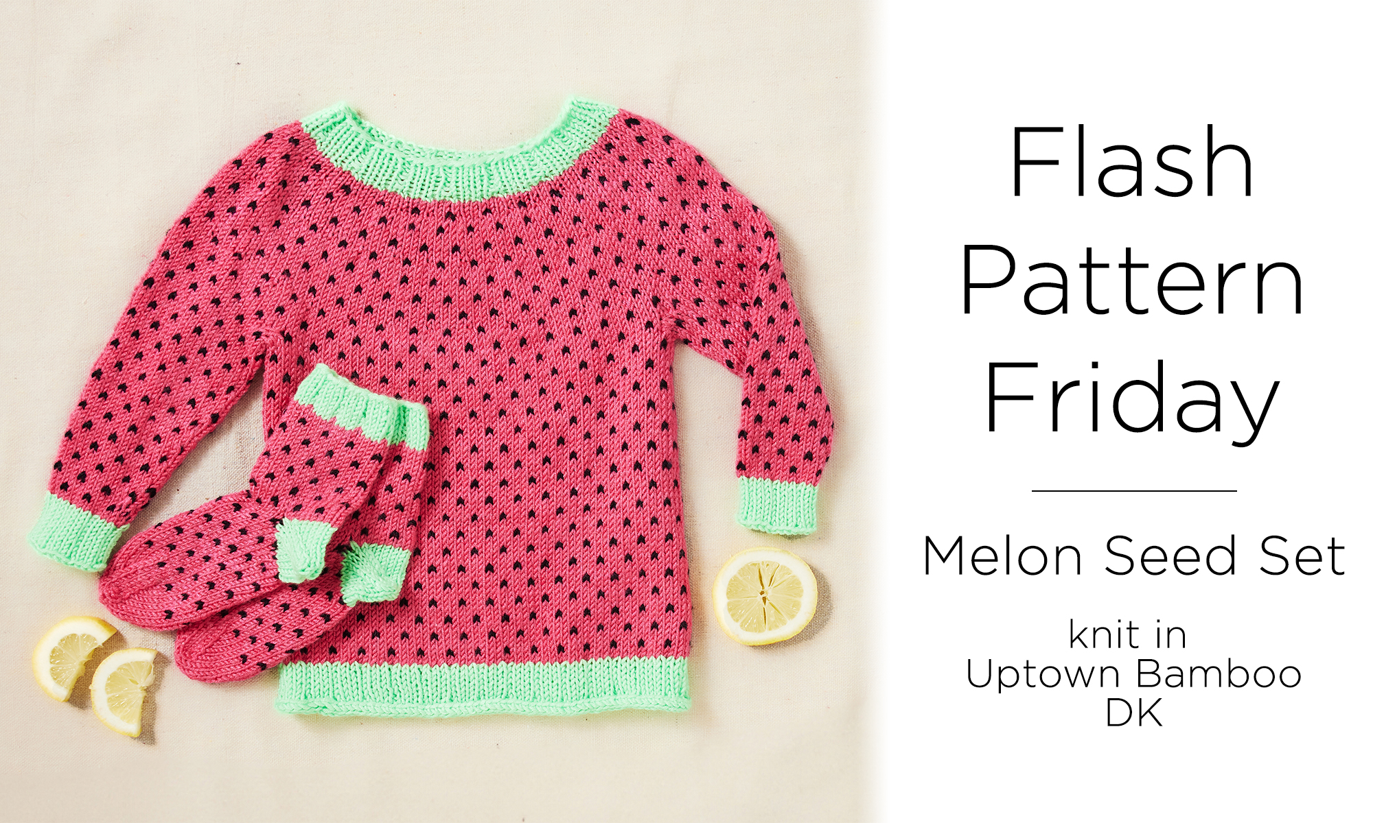 What’s sweet as can be and bursting with fresh summer fun? Why, this week’s Flash pattern of course! Every day’s a picnic when your little one is sporting the matching pullover and socks in Rachel Brockman’s adorable Melon Seed Set. Enjoy the pattern for free, this weekend only, using coupon code FLASH on Ravelry.